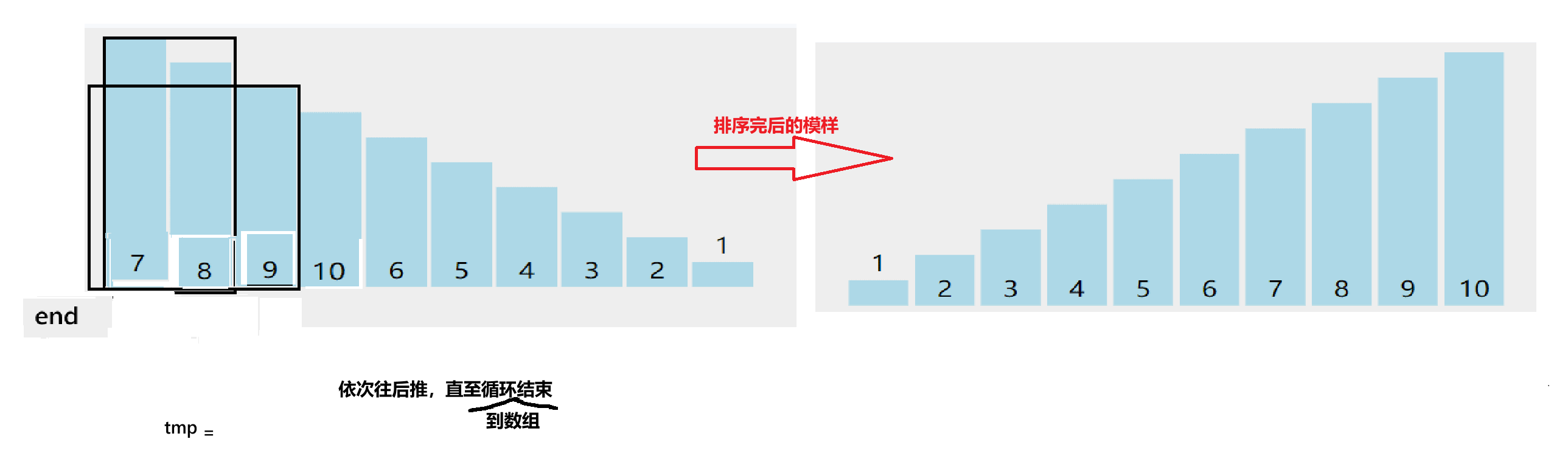 //让arr[end]与tmp比较,若arr[end] > tmp :当end >= 0将arr[end]元素挪到arr[end + 1]处,再让end--,直到end < 0时,然后将tmp保存的值赋给