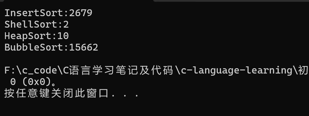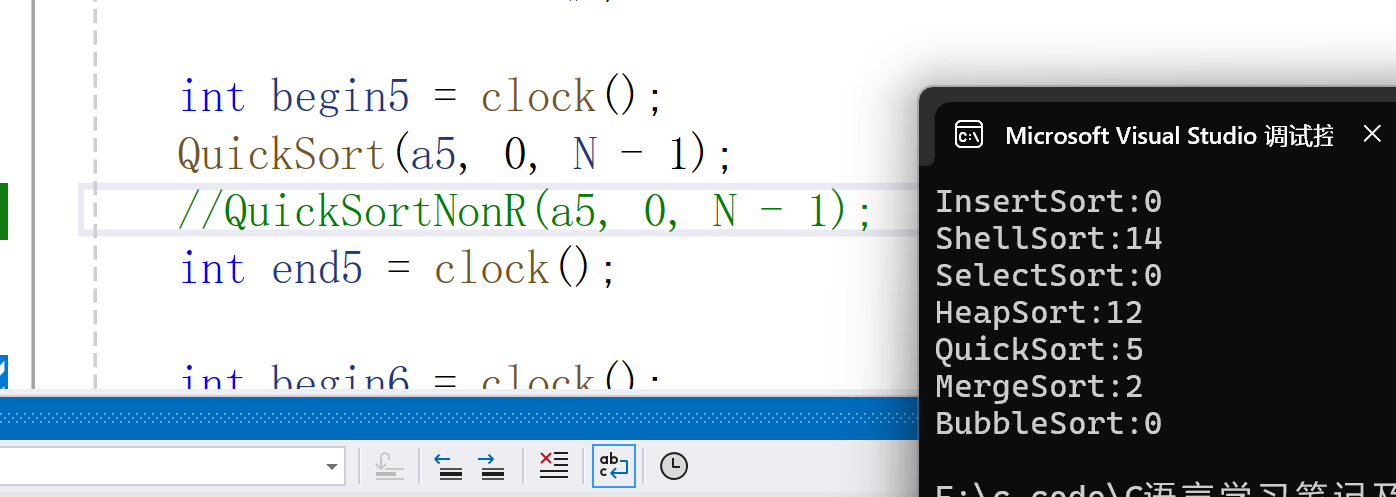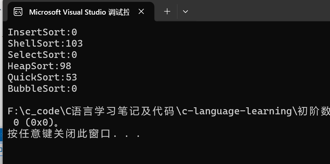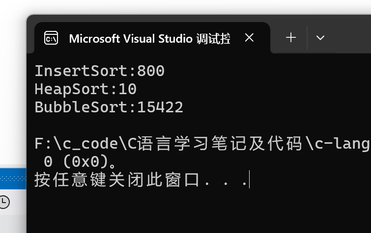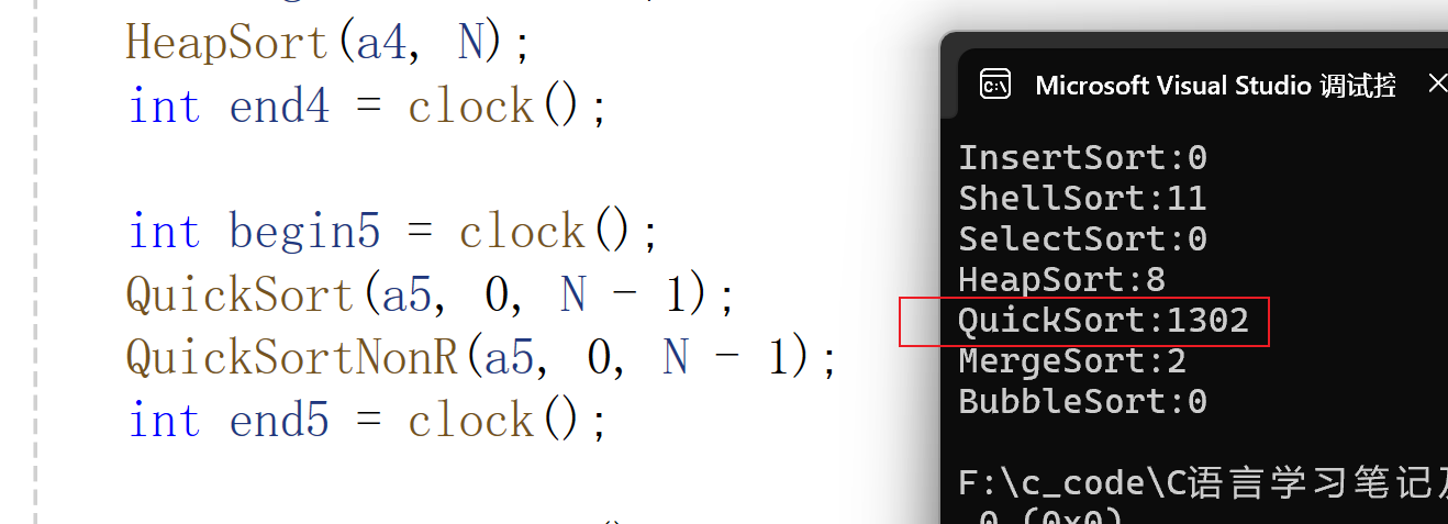 Debug条件下运行代码它会加载以下调试的运行信息,出结果较慢,这里测试各个排序的算法好坏用Realase更快