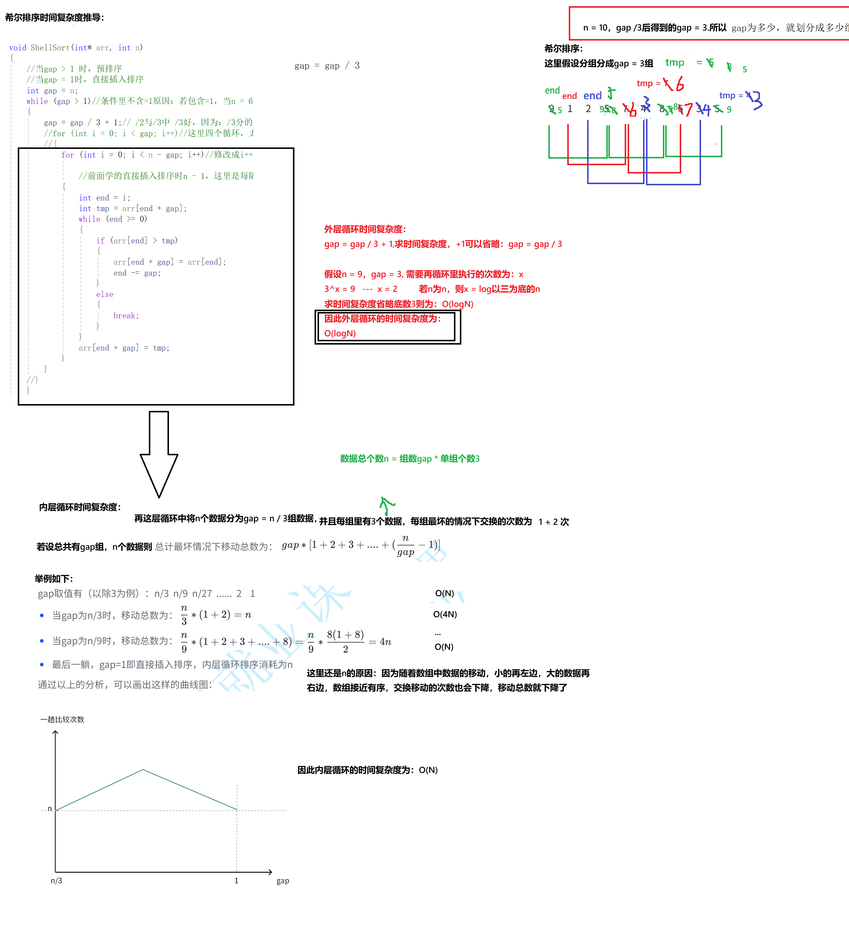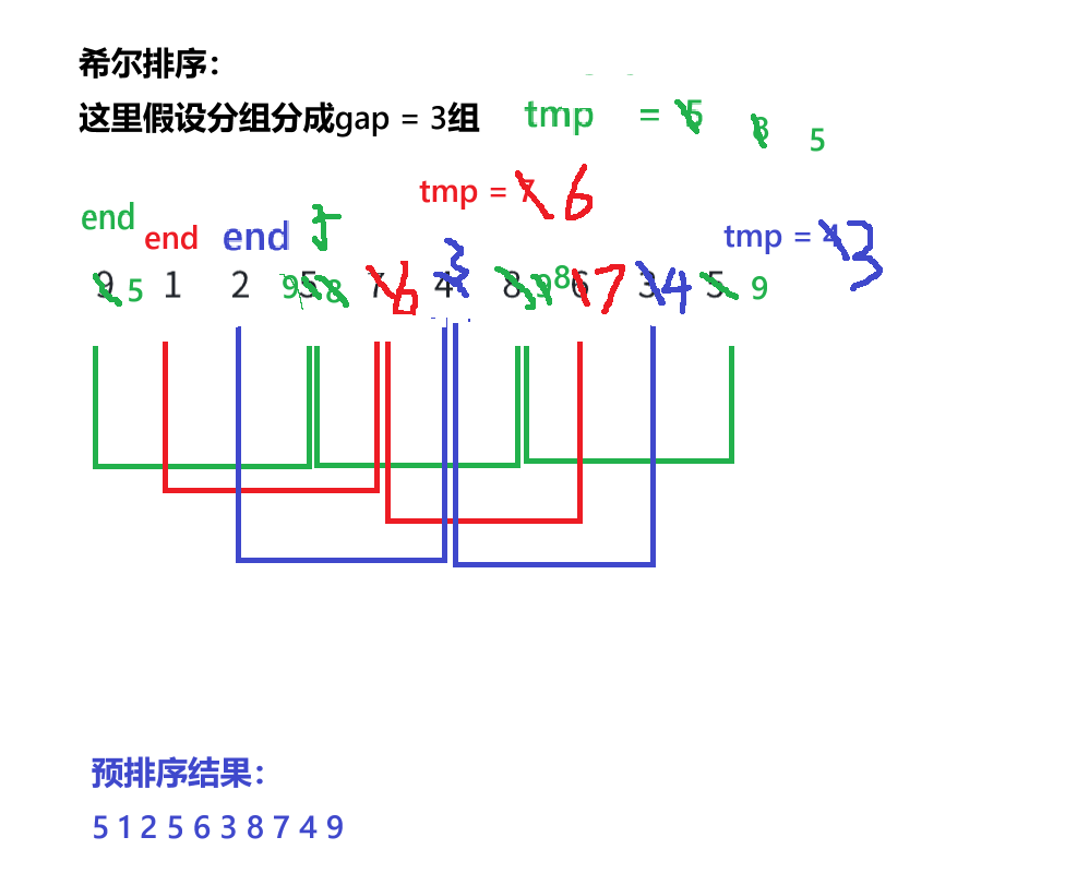 思路:先创建gap组,创建两个整型变量 end:作为有序数组最后一个元素的下标,tmp:保存与end比较的end + gap的值;先让arr[end]与tmp比较,若arr[end] > tmp :当end >= 0时将arr[end]元素挪到arr[end + gap]处,再让end-=gap,直到end < 0时,然后将tmp保存的值赋给arr[end + gap]处,若arr[end] < tmp:说明是有序的,直接break跳出循环。循环遍历到gap的组数结束
