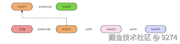 先执行父类中的构造器,再执行子类的构造器:如果trait1也有自己的父类,要先执行父类构造器