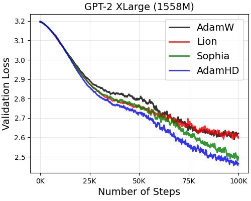 图2:在GPT-2 1.5B模型上,AdamHD(蓝色)的验证损失下降速度明显快于AdamW(橙色)。