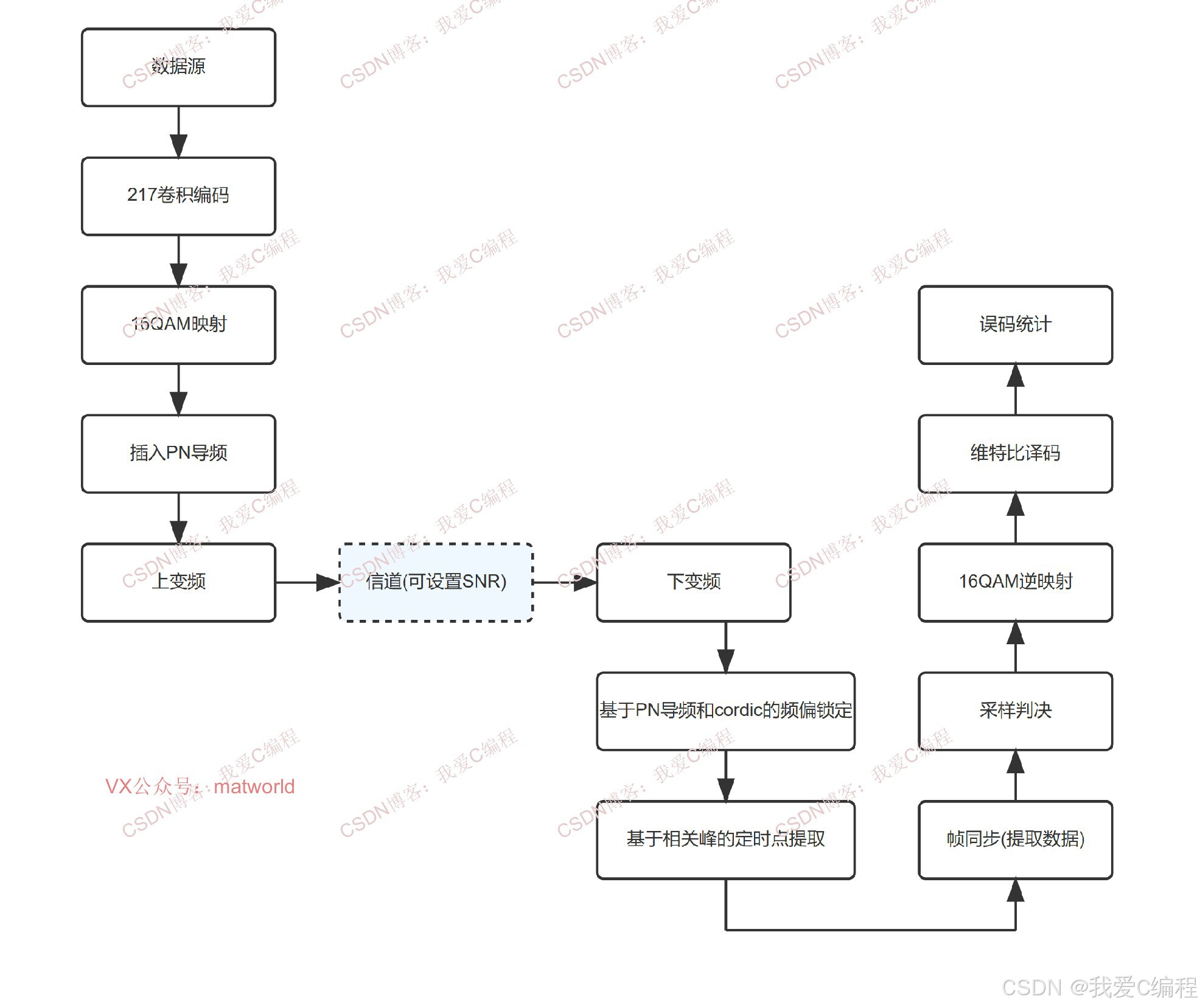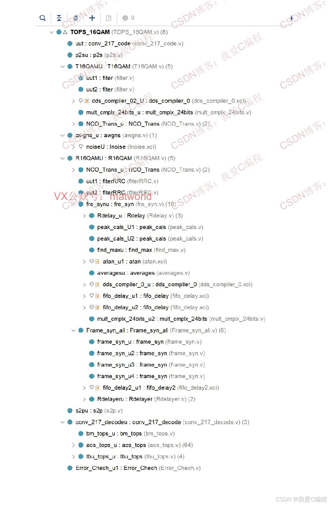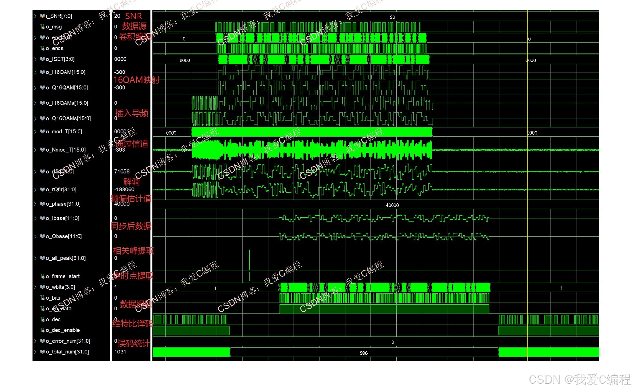基于FPGA的完整16QAM通信链路实现,含频偏锁定,帧同步,定时点,Viterbi译码,信道,误码统计。系统包括16QAM调制模块,16QAM解调模块,217卷积编码模块,维特比译码模块,AWGN信道模块,误码统计模块,数据源模块,基于PN序列和cordic算法的频偏估计和补偿模块,基于PN相关峰提取的帧同步和定时点提取模块等。