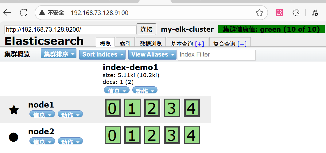 浏览器访问 http://192.168.73.128:9100/ 查看索引信息