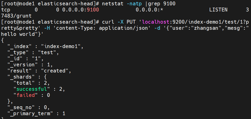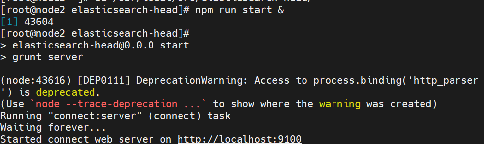 #必须在解压后的 elasticsearch-head 目录下启动服务,进程会读取该目录下的 gruntfile.js 文件,否则可能启动失败。