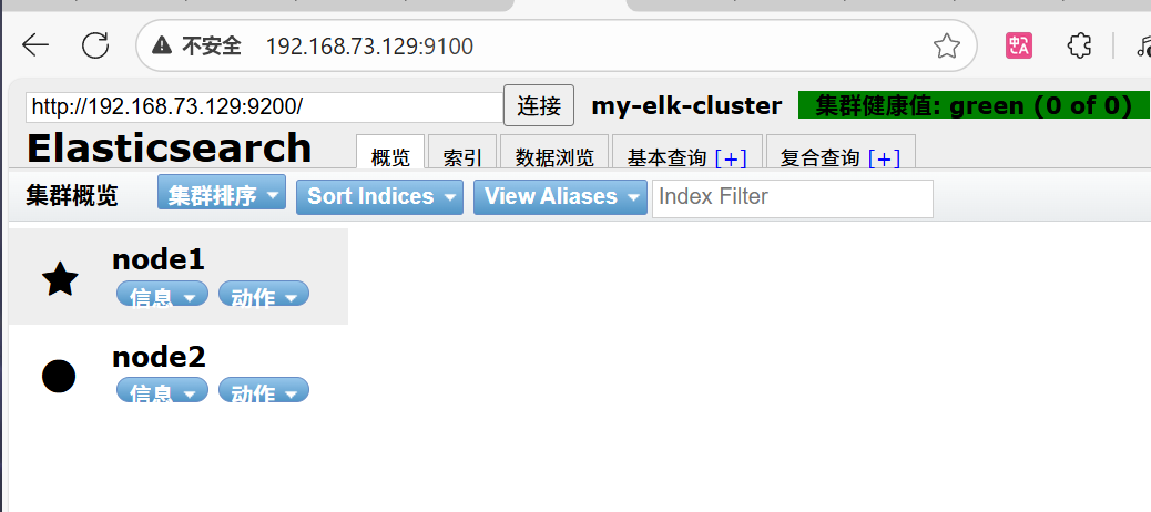 通过浏览器访问 http://192.168.73.129:9100/ 地址并连接群集。如果看到群集健康值为 green 绿色,代表群集很健康。