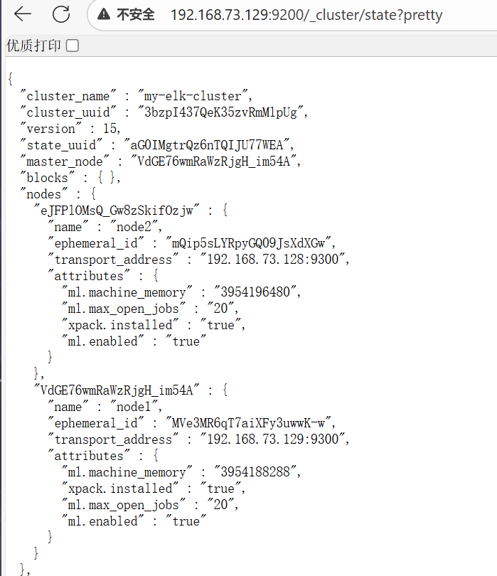 浏览器访问 http://192.168.73.129:9200/_cluster/state?pretty 检查群集状态信息。