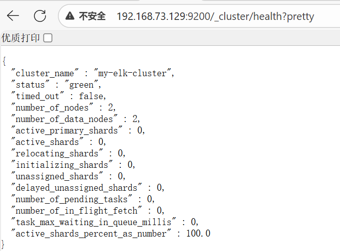 浏览器访问 http://192.168.73.129:9200/_cluster/health?pretty 、 http://192.168.73.128:9200/_cluster/health?pretty查看群集的健康情况,可以看到 status 值为 green(绿色), 表示节点健康运行。