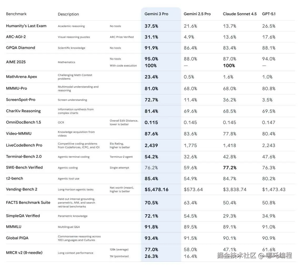 简单来说,这是一份吊全场的成绩单,直观地展示了 Gemini 3 Pro 不仅超越了 GPT-5.1,更是目前当之无愧的"地表最强"AI。