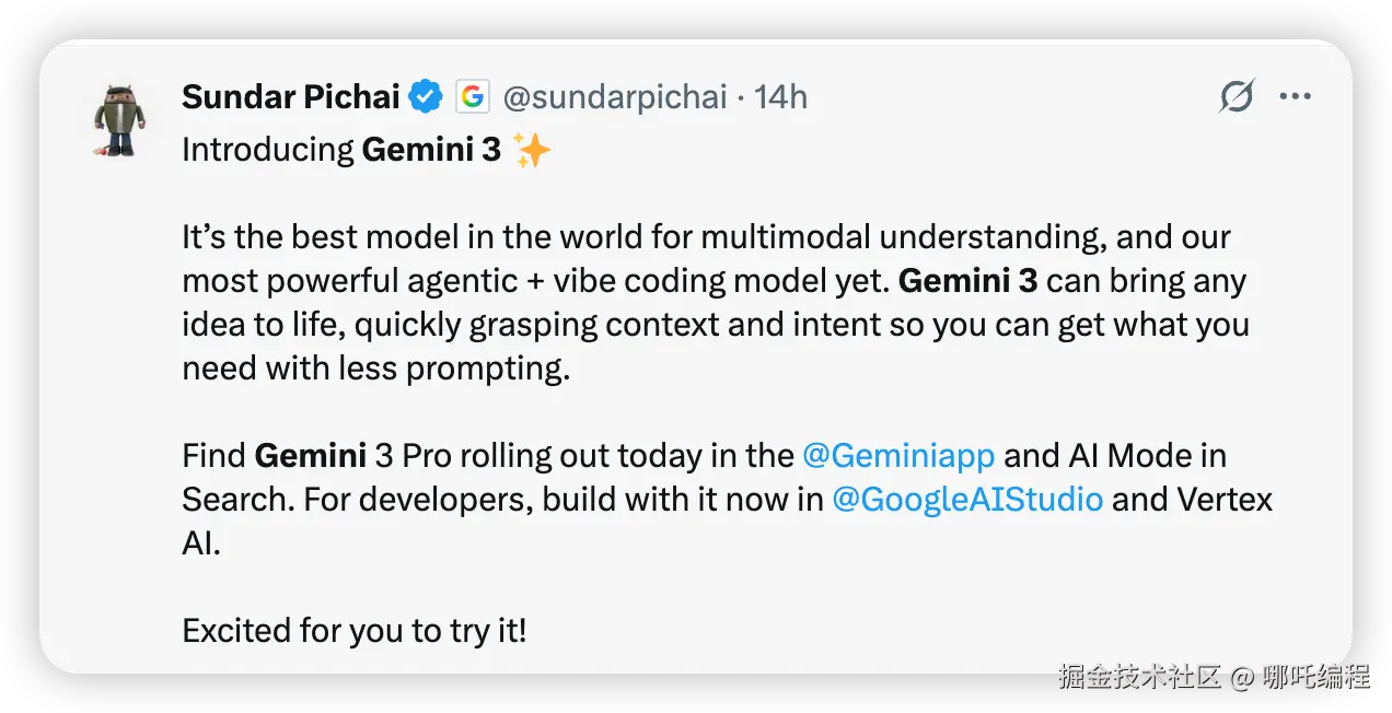 谷歌 CEO Sundar Pichai表示,Gemini 3是世界上最好的多模态理解模型,也是我们迄今为止最强大的代理+感应编码模型。Gemini 3能把任何想法变成现实,迅速掌握上下文和意图,所以你可以在更少的提示下得到你想要的。