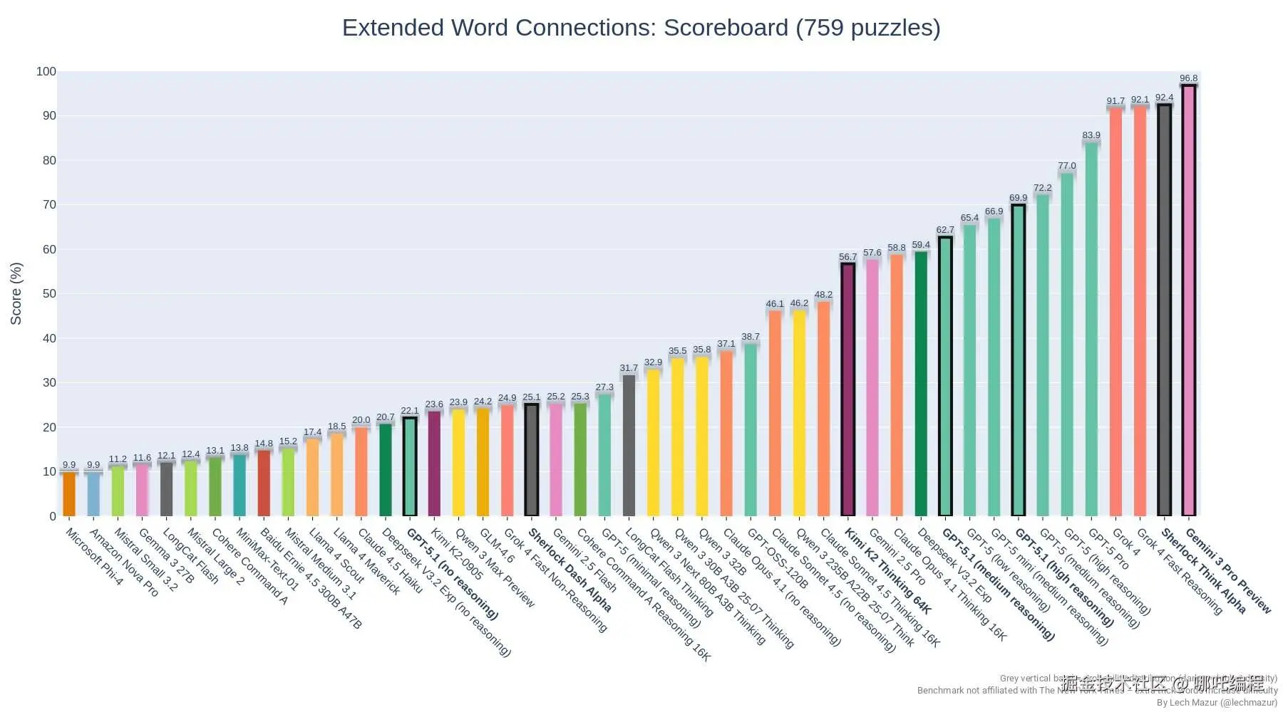 断层第一:看图表最右侧,Gemini 3 Pro Preview 以 96.8% 的惊人高分占据榜首,几乎接近满分。