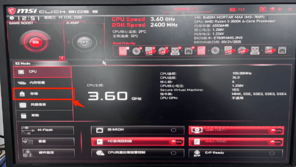 del键,进入BIOS,简易模式下,点击存储,发现确实显示M2_2上有一块1TB固态硬盘