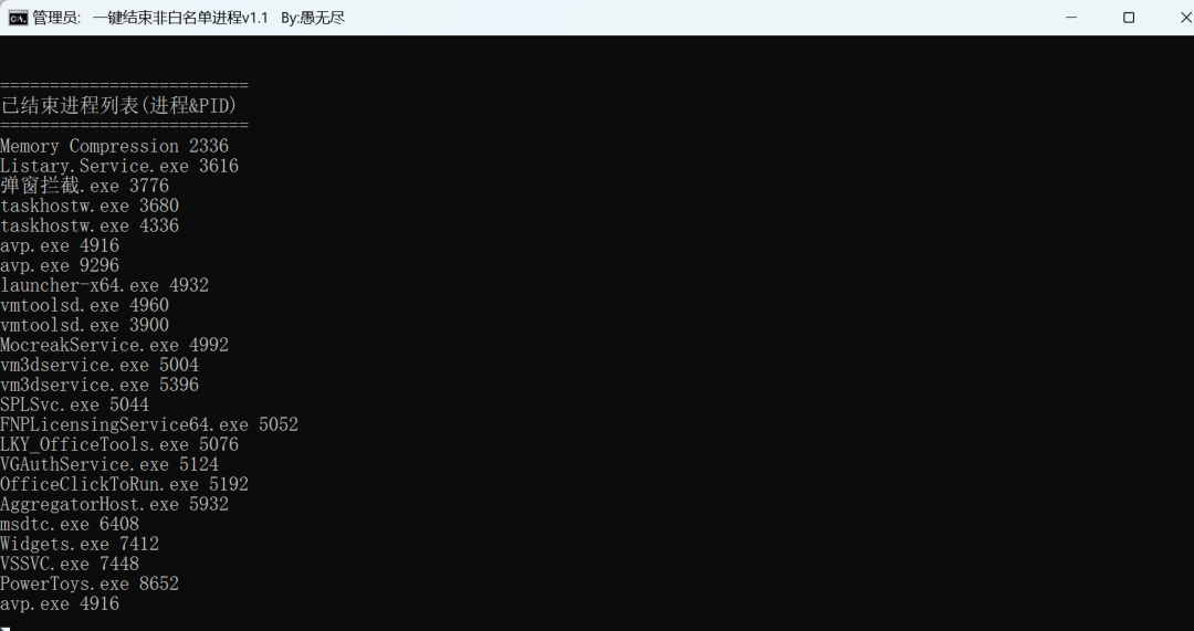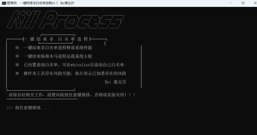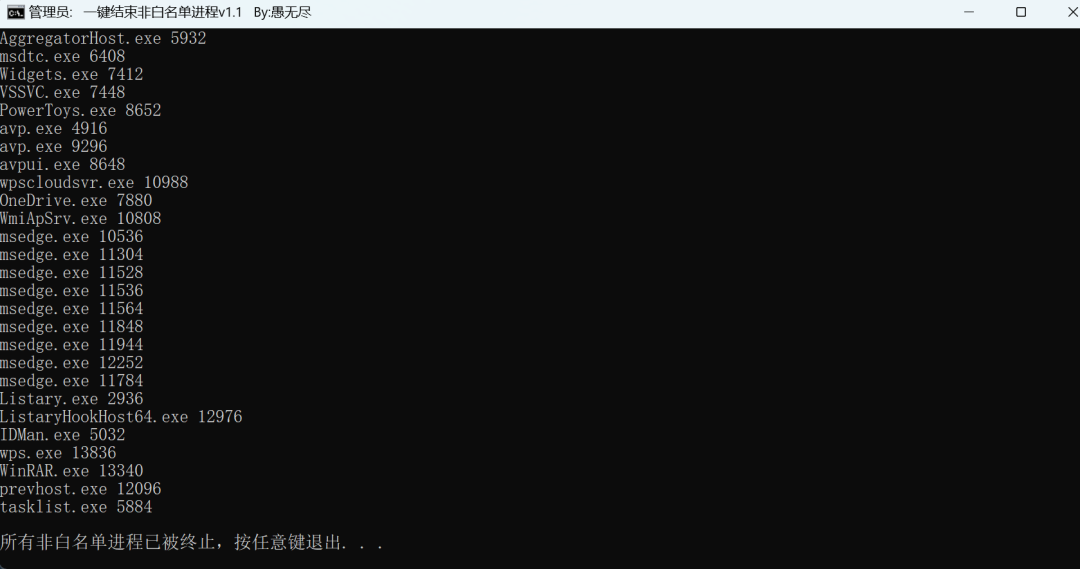 双击打开"一键结束非白名单进程v1.1.bat",界面长得下面这样,想要恢复到重启时电脑的进程状态,按任意键即可继续。