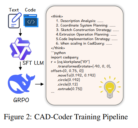 输入是零件文本描述+对应的CadQuery代码 ,经过有监督微调(SFT)的LLM 和GRPO优化策略,让模型学会"有逻辑地生成代码"------生成前会先做"思考":
