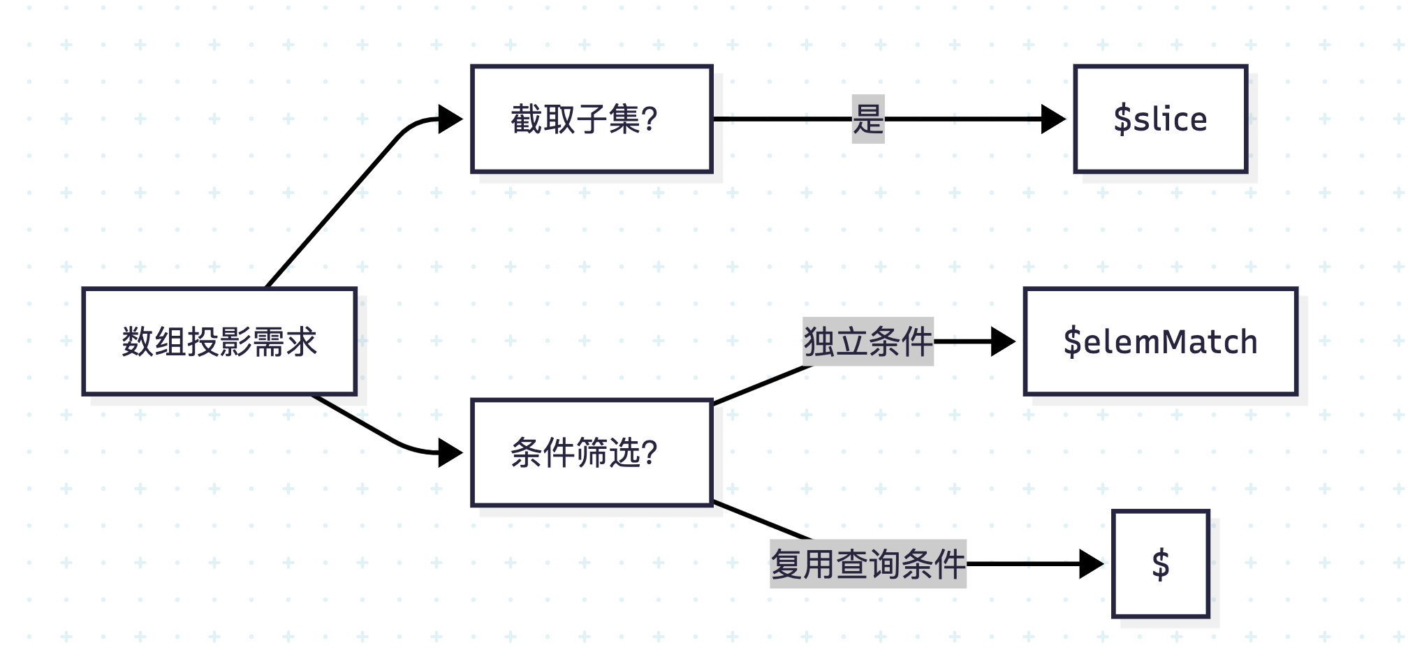 sort → skip → limit,投影禁止字段混用。 - 数组操作符根据条件来源灵活选择(