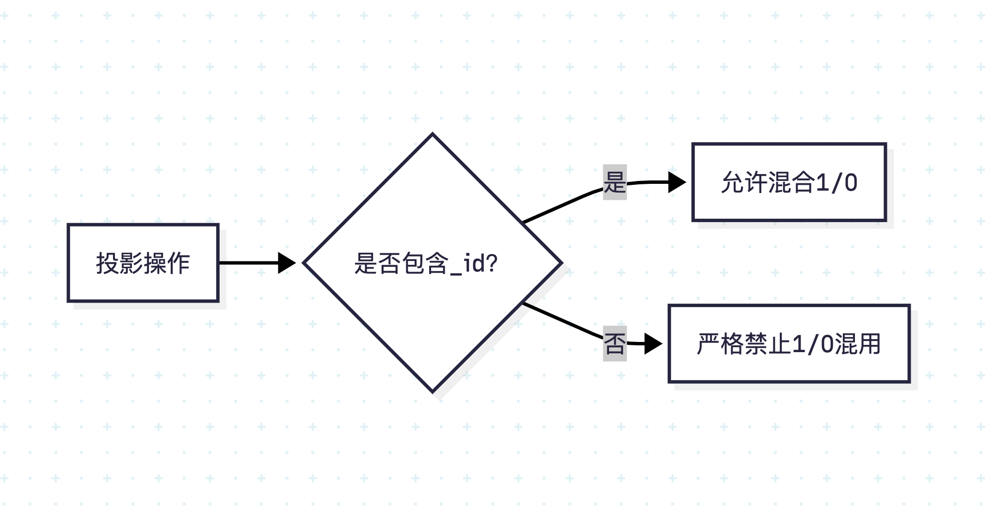 | 投影冲突 | 禁止混用 1(包含)和 0(排除)(_id 除外) |