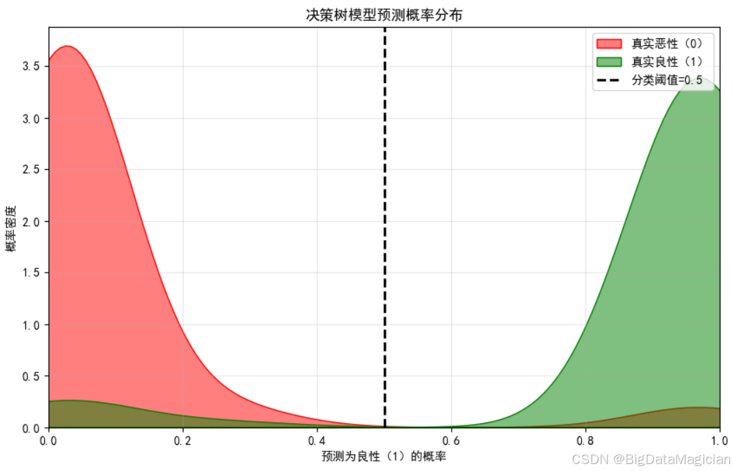 本次可视化中,分别以红色、绿色填充区域代表"真实恶性""真实良性"样本的预测概率分布,并添加默认分类阈值(0.5)辅助观察:当样本预测为良性的概率≥0.5时,模型判定为良性;反之则判定为恶性。