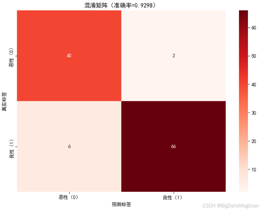 从可视化结果可直观观察到,热力图中深色区域集中在"真实恶性-预测恶性""真实良性-预测良性"的对角线上,说明多数样本被正确分类;非对角线区域(误判样本)的颜色较浅且数值较小,对应仅2例恶性样本被误判为良性、6例良性样本被误判为恶性,与之前的量化结果一致。