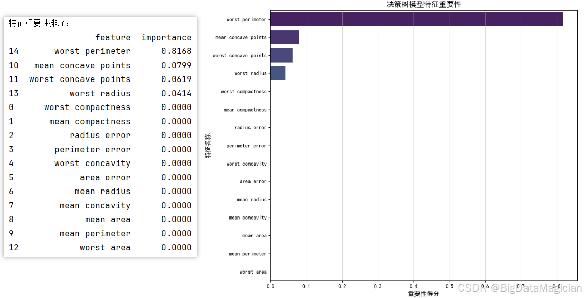 这一结果与医学认知相契合------肿瘤的周长、凹点等形态学特征是临床判断良恶性的经典指标,也验证了该决策树模型的特征选择逻辑符合实际诊疗的关注重点,同时简化了后续特征采集的成本(仅需重点关注少数核心特征)。