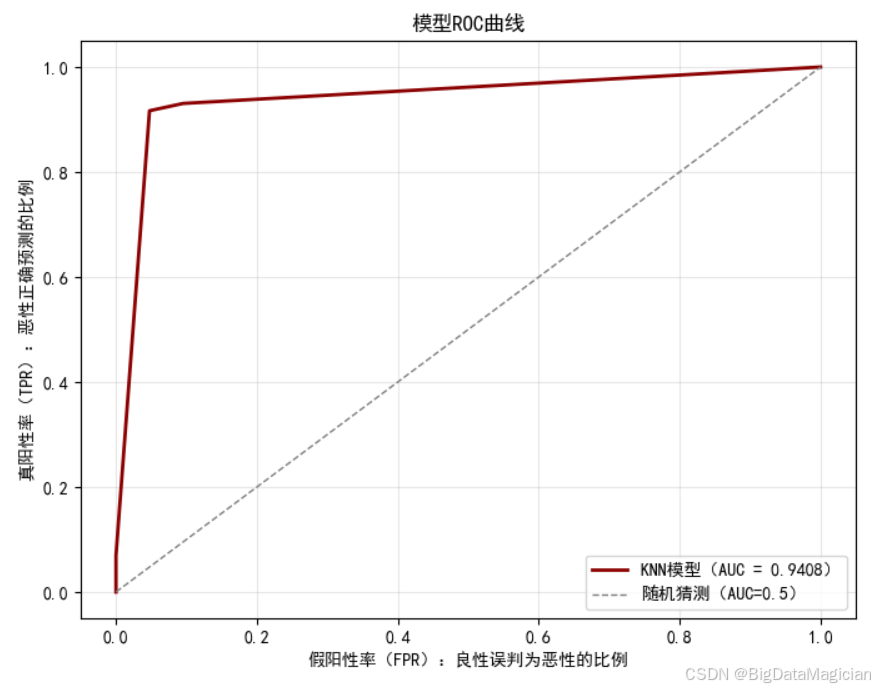 从结果可见,模型ROC曲线明显偏离随机猜测基准线,整体向左上角凸起,说明在多数阈值下,模型能同时保持较高的真阳性率与较低的假阳性率;对应的AUC值达0.9408,接近1,进一步验证了模型对恶性、良性样本的强区分能力------这意味着在乳腺癌诊断场景中,该模型既能有效识别恶性肿瘤(减少漏诊),又能控制对良性样本的误判(避免过度医疗)。该可视化结果直观印证了模型的分类可靠性,是评估其临床实用价值的重要依据之一。
