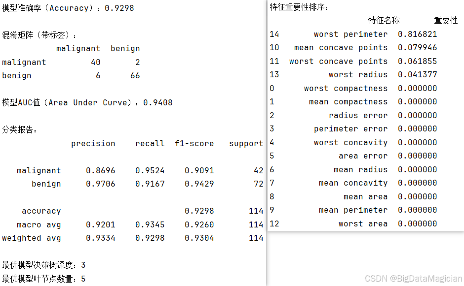 这种分层判断的逻辑与临床诊断的"逐步排查"思路高度契合,模型先通过最关键的特征(最差周长)做初步区分,再结合次要核心特征细化判断,既保证了分类的准确性,又让决策过程透明、可追溯------这在医疗场景中尤为重要,能帮助医生理解模型结论的依据,提升对模型的信任度。