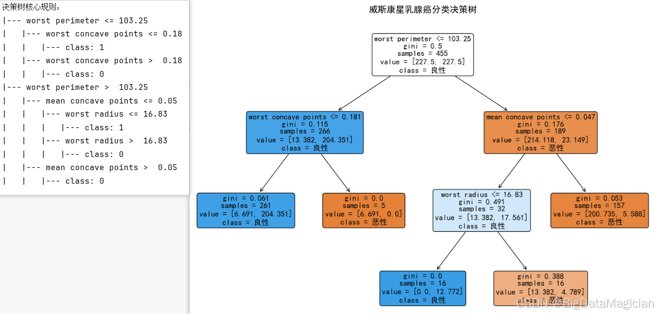 - 后续层级:基于"worst concave points(最差凹点)""mean concave points(平均凹点)""worst radius(最差半径)"等核心特征进一步细分,最终输出"恶性"或"良性"的类别结论。