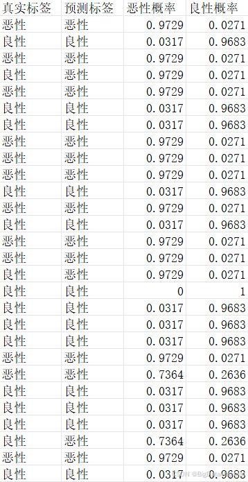 从结果可见,真实恶性样本的预测良性概率集中在0-0.1区间(多数接近0),真实良性样本的预测良性概率集中在0.9~1区间(多数接近1),两类分布几乎无重叠;分类阈值(0.5)恰好处于两类分布的间隔区域,说明在默认阈值下,模型能通过概率值明确区分恶性与良性样本,仅极少数样本的概率会接近阈值导致误判。