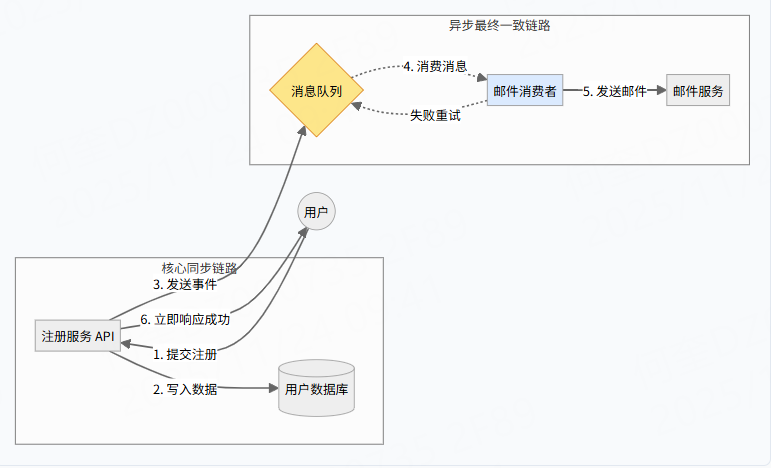 这是 CAP 取舍最经典的落地场景。我们不希望仅仅因为邮件服务器繁忙,就导致用户注册失败。
