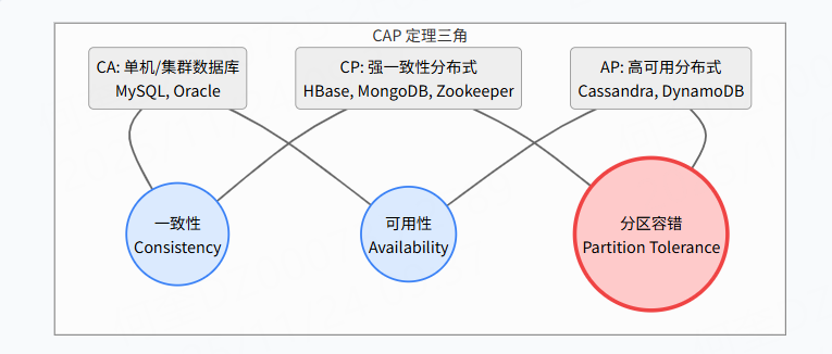 在分布式系统中,网络分区(Network Partition)是必然会发生的(网线被剪断、路由器故障、延迟过高)。因此,分区容错性 (P) 是必须保证的。