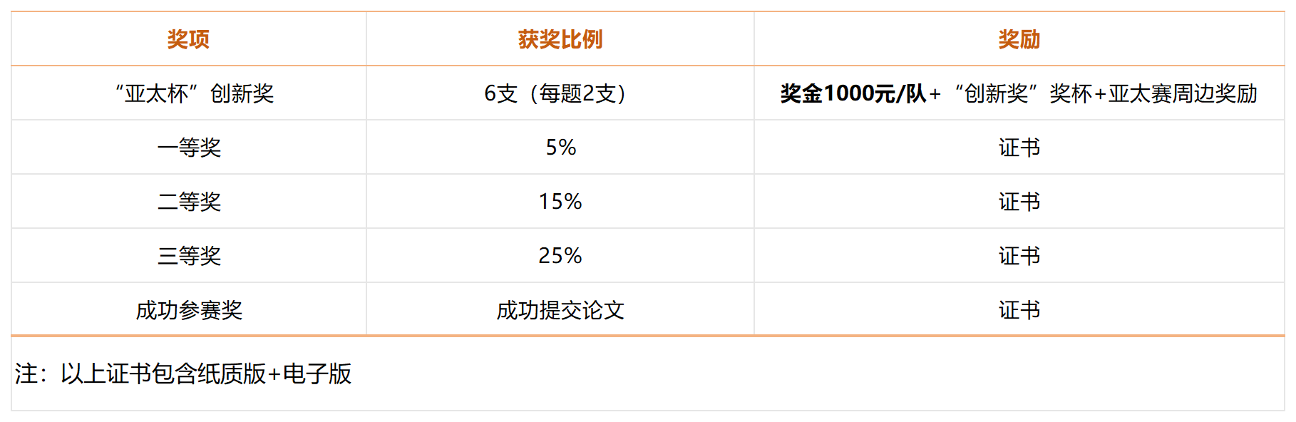 所有参赛队伍均可申请 ,每个奖项评选出10支队伍,获奖队伍将获得:获奖证书、电子工业出版社出版的《全国大学生数学建模竞赛指南》三本、亚太赛周边专属礼品。