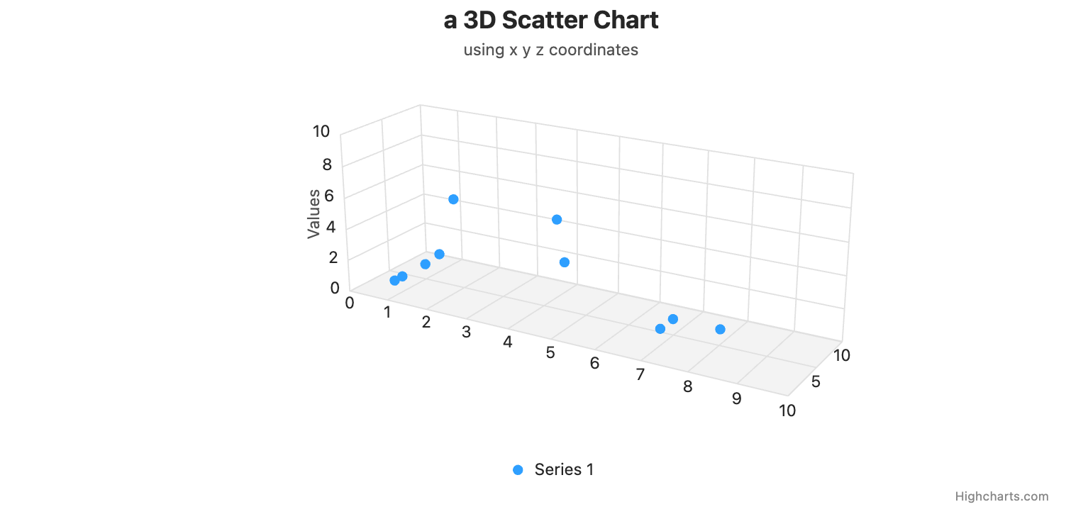 除了像普通scatter chart 散点图那样的x和y坐标外,3D插件还为每个点添加了一个额外的z坐标,以实现三维空间中的位置。与普通图表类似,这些坐标可以直接传递,也可以使用数组的形式。