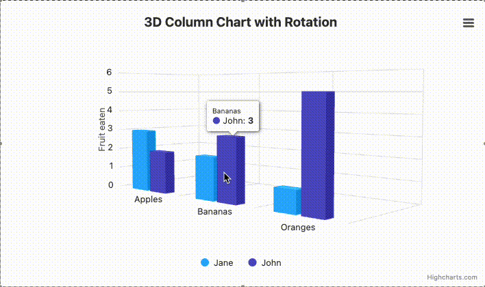 就像普通柱状图一样,Highcharts 的 3D 插件也允许显示一系列图表,并可以使用 分组grouping 和 堆叠stacking 等技术按需排列。