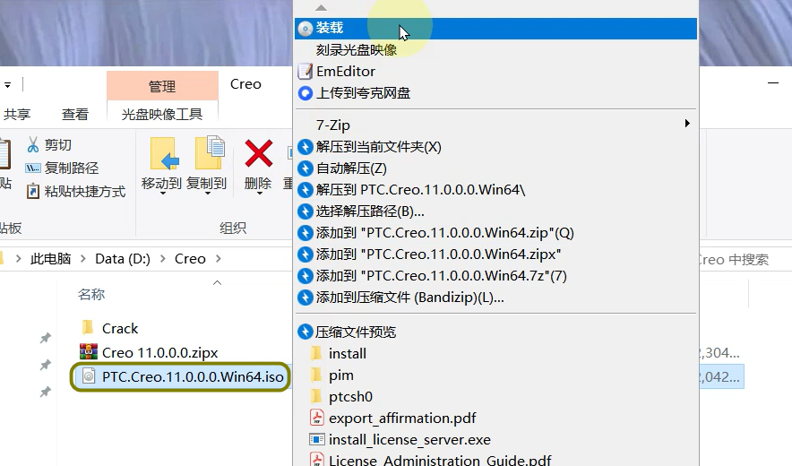 7、返回解压出来的文件夹找到PTC.Creo.11.0.0.0.Win64.iso点击装载 (如果没有 装载 选项可以右键选择打开方式 windows资源管理器打开,win7右键解压)