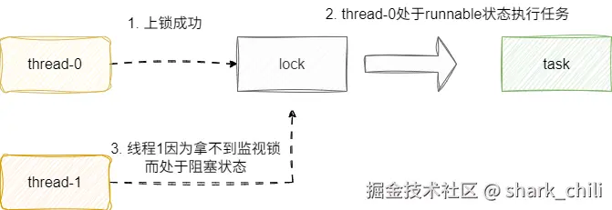 因为并发互斥原因,线程需要等待其它线程释放监视锁而进入BLOCKED阻塞态: