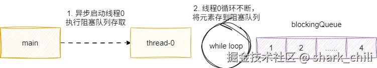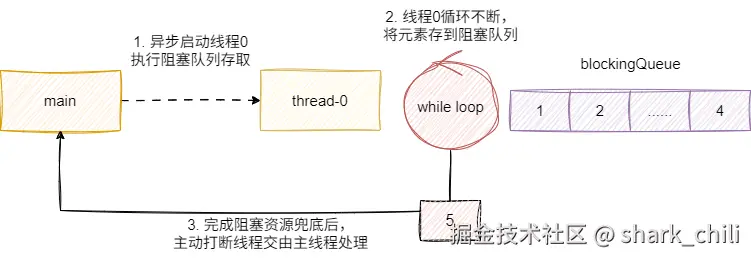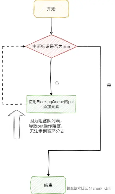 当然这种做法也存在一定的弊端,即带有阻塞性质的操作,任务可能出现永远无法检查取消标志,例如我们的线程在循环往阻塞阻塞队列blockingQueue的put添加元素,一旦队列空间达到容器上界,当前线程就会阻塞即无法执行到循环分支上: