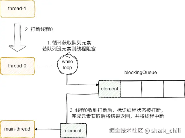 - 获取到元素并返回,在返回前将当前线程打断,让外部感知