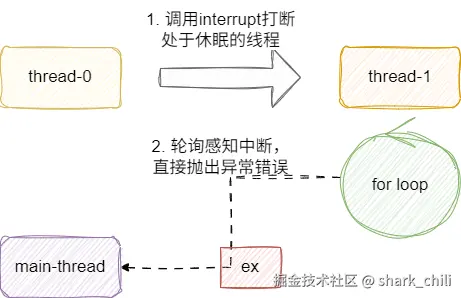 参考java内置方法Thread.sleep(1000);或者wait()方法,其底层都会针对外部中断操作做检测,一旦感知到中断就会提前返回,即执行如下步骤: