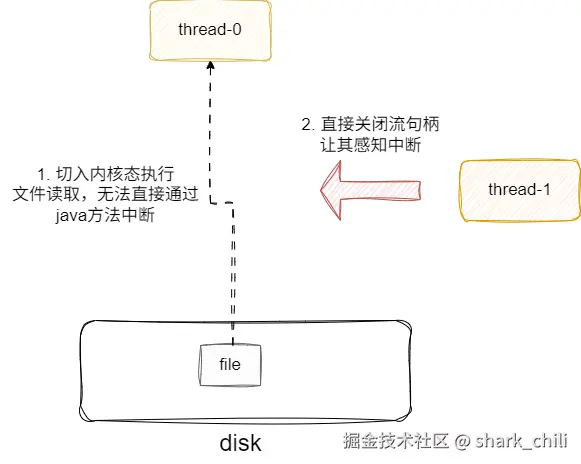 对应的我们以文件IO为例给出代码示例,可以看到我们通过继承thread重写其中断方法,当我们需要打断系统资源时,直接关闭其流通道让工作线程感知到这一点,然后通过原生interrupt修改中断状态: