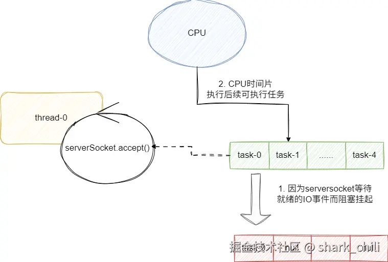 按照操作系统对于线程的任务调度管理来说,当触发以下几种情况时线程就会阻塞而处于BLOCKED、WAITING、TIMED_WAITING几种状态: 第一种是线程执行IO请求,在等待IO资源返回,触发阻塞,此时线程就处于BLOCKED状态,例如服务端server执行serverSocket.accept()等待就绪的客户端接入: