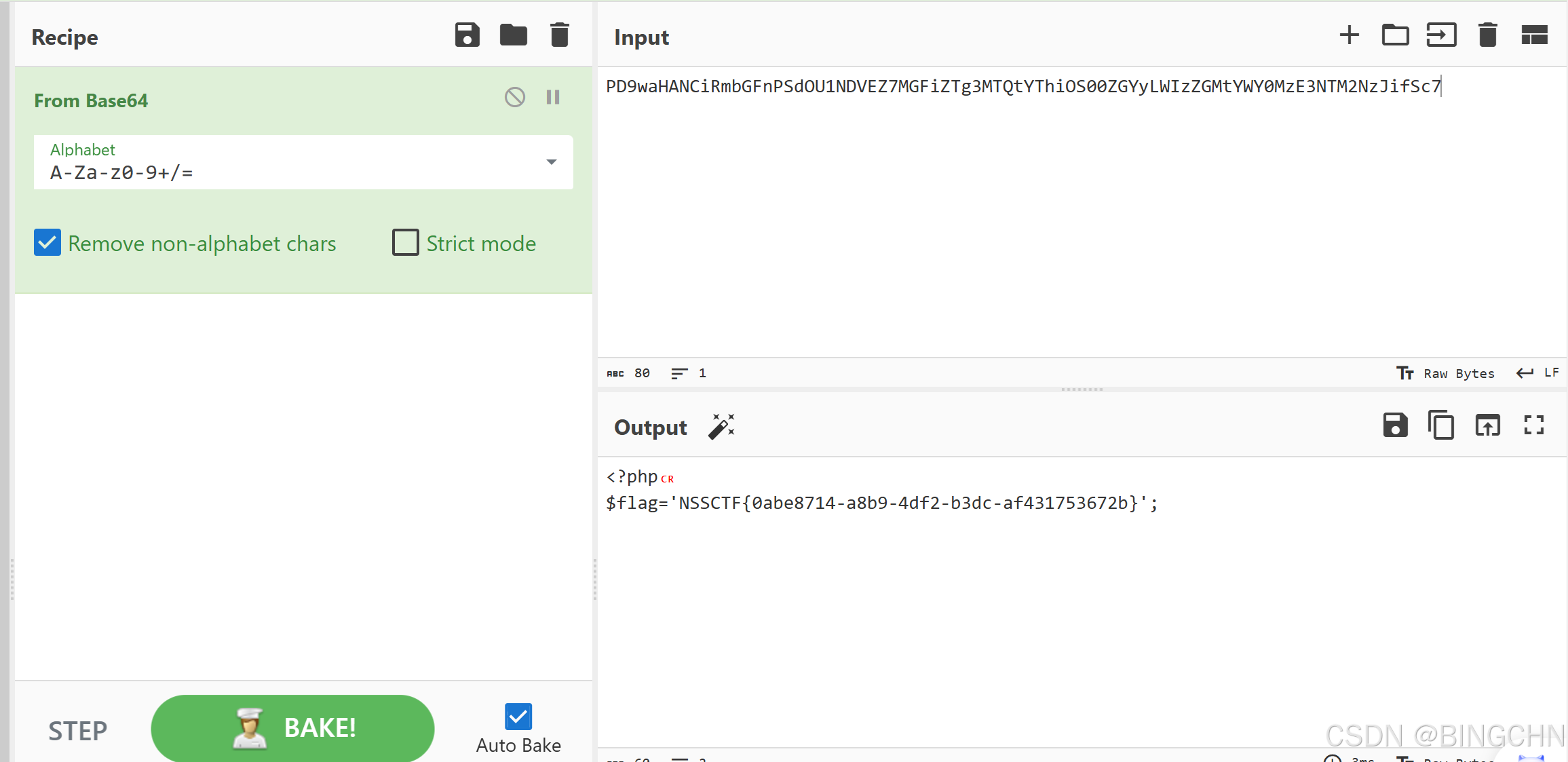 PD9waHANCiRmbGFnPSdOU1NDVEZ7MGFiZTg3MTQtYThiOS00ZGYyLWIzZGMtYWY0MzE3NTM2NzJifSc7。一眼base64,直接cyberchef解。
