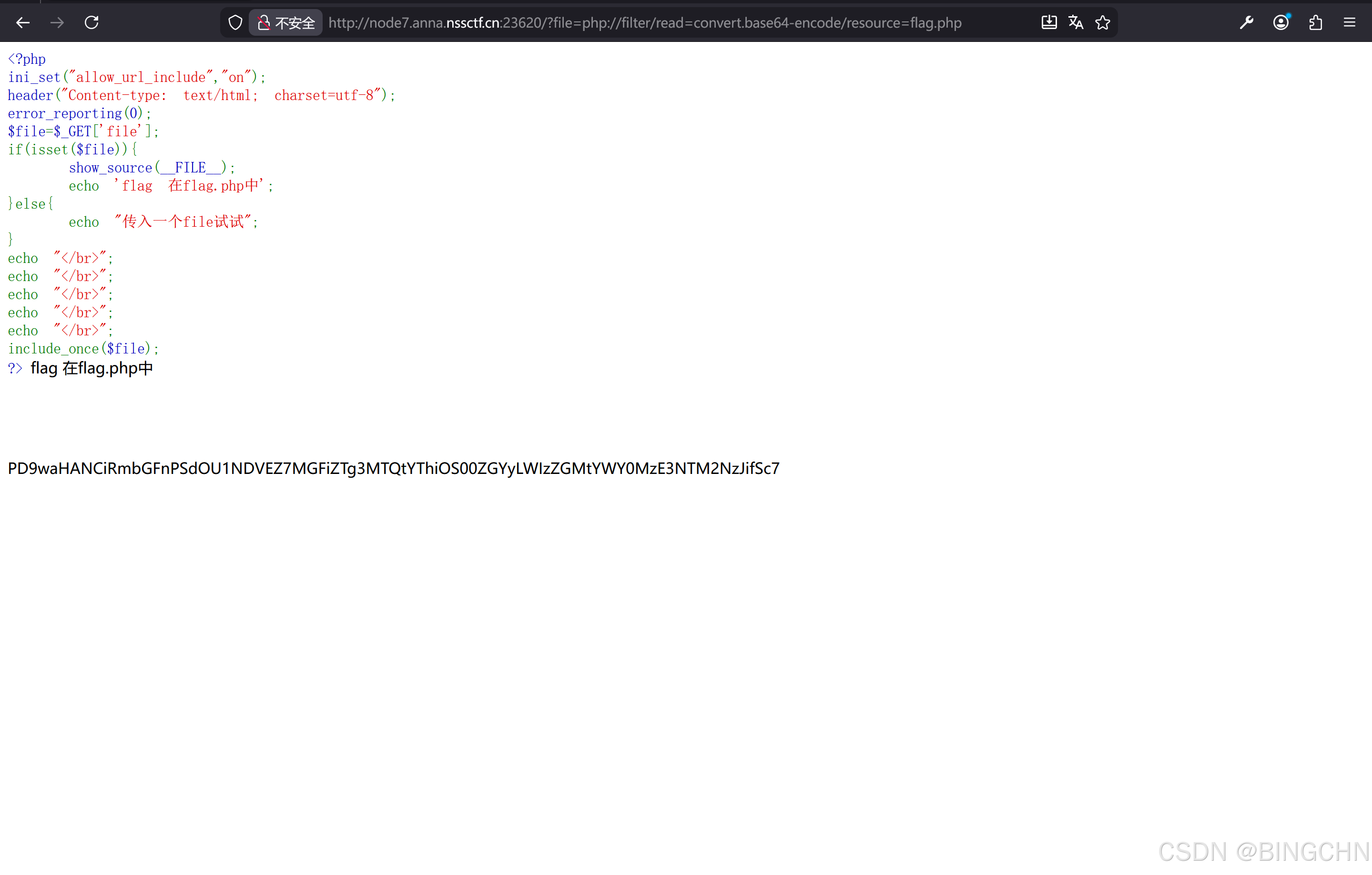 可以看到有个ini_set 设置了参数为on;可以用php伪协议filter进行文件读取。直接读取flag所在的目录也就是flag.php。那么payload就是:URL+/?file=php://filter/read=convert.base64-encode/resource=flag.php;然后得到了