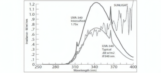 UVA-340灯 (315-340nm峰值)精准匹配户外正午UV光谱,适用于汽车外饰、建筑涂料等户外材料的长期老化;