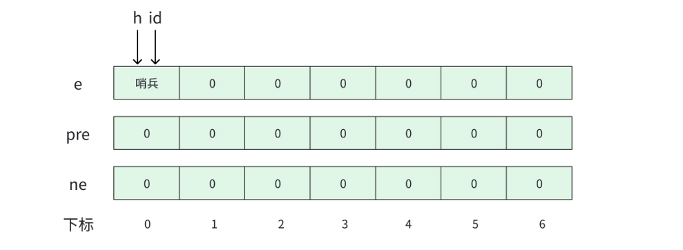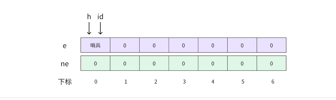 // 其中ne数组全部初始化为0,其中ne[i] = 0就表⽰空指针,后续没有结点