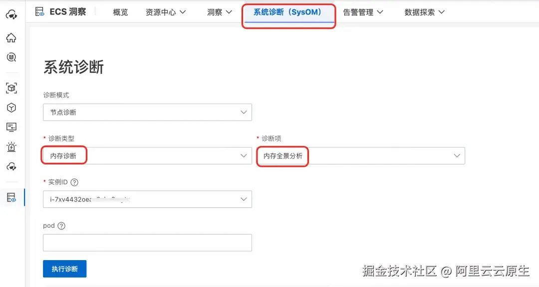 针对上述场景,先找到 Pod 所在的 ECS 节点,通过使用 SysOM 使用内存全景分析诊断,选择目标 ECS 节点后,再选择目标 Pod,发起诊断: