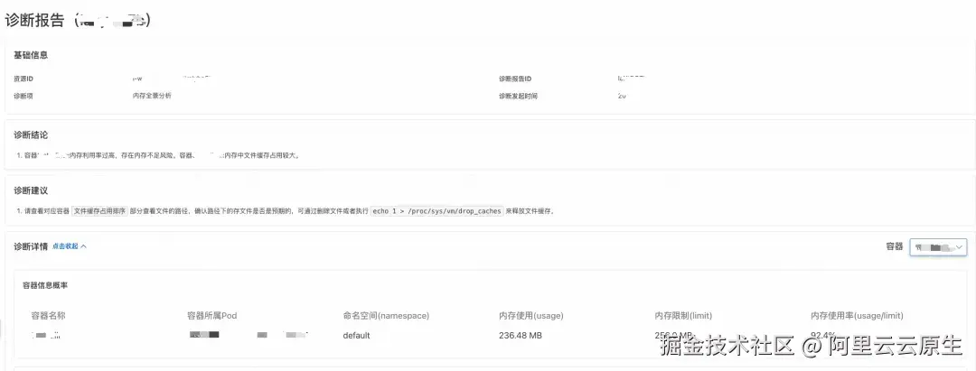 诊断结论明确指出:容器 xxx 内存使用率过高,存在内存不足风险,主要因文件缓存占用较大。