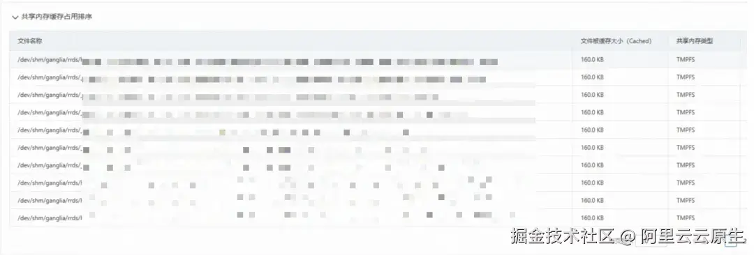 诊断结论明确指出:共享内存占用过高(34.35 GB),且以大量小文件(如 160 KB)为主,疑似存在泄露。从共享内存缓存占用排序表可见,占用最高的前 30 个文件均来自 /dev/shm/ganglia/*,证实了小文件泄漏问题。由此判断,客户业务程序在该目录下创建了共享内存文件但未及时释放。结合业务场景评估后,可直接删除这些文件以释放缓存内存。