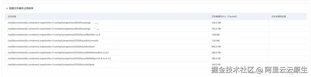 查看文件缓存排序表可见,前两个容器中的日志文件(路径为宿主机映射路径,容器内实际位于 /var/log)共占用约 228MB 缓存,系业务程序读写日志所致。