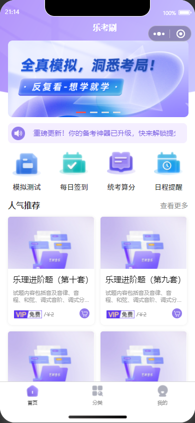 一款可灵活适配多品类的通用刷题小程序。有前后端完整源码和数据库,易于二次开发。还可用于考试活动,企业内部考核,内部培训等职业考试刷题。