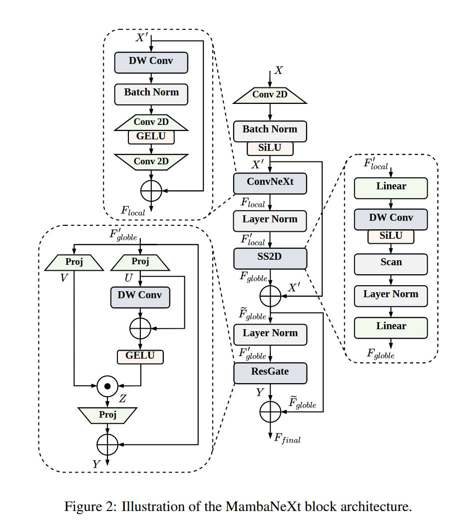 - Figure 2 清晰地描绘了数据流在 MambaNeXt Block 中的"分流-处理-汇合"过程:数据先流经 ConvNeXt 变"厚"(提取局部特征),再流经 Mamba 变"广"(提取全局特征),最后通过 ResGate 变"精"(特征筛选)。