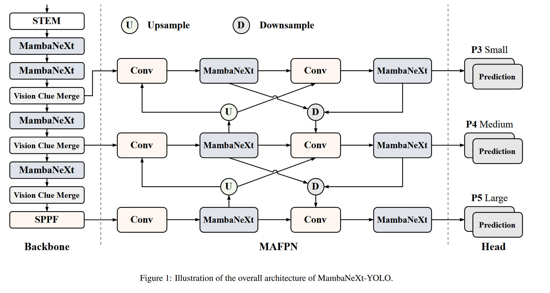 - 分析 :图中清晰地显示了 Backbone 由 STEM 、堆叠的 MambaNeXt 模块和 Vision Clue Merge 模块组成。这反映了作者的动机:用混合模块(MambaNeXt)替代传统的纯 CNN 或纯 Mamba 模块,以在特征提取阶段就兼顾局部与全局信息。同时,Neck 部分采用了复杂的跨层连接(MAFPN),旨在解决多尺度目标检测的难题。