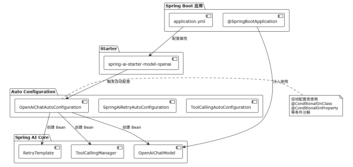 Spring AI 通过 Spring Boot Starter 和 Auto Configuration 机制,实现了零配置的 AI 应用开发。开发者只需要添加依赖和配置属性,就能使用各种 AI 能力。